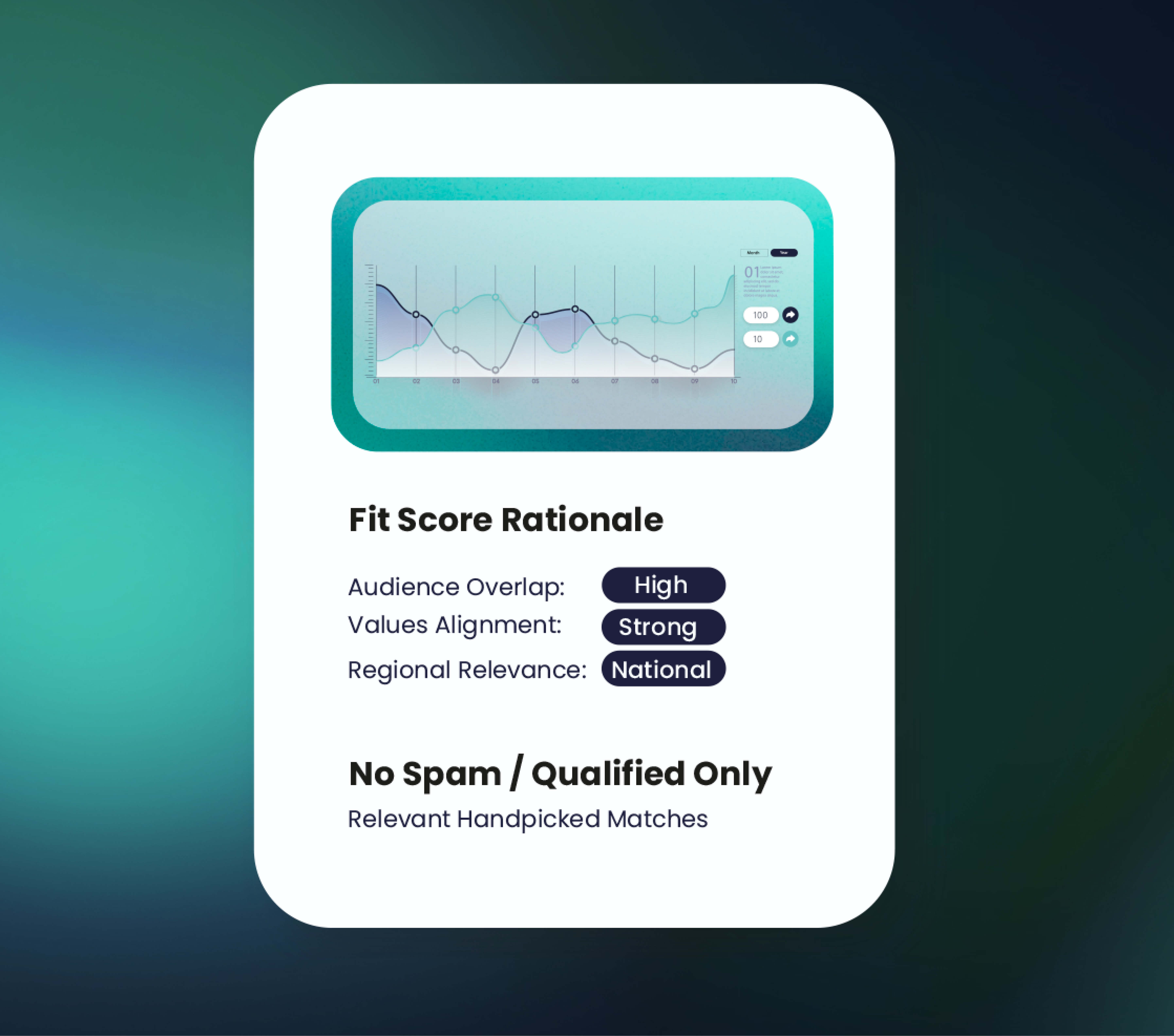 We score partners on audience overlap, category fit, values alignment, and regional relevance— then request consent from both sides before any introduction.